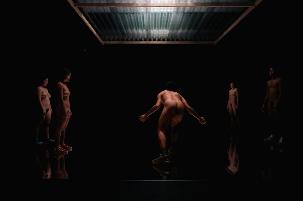 Shaking shame puts you in the middle of a landscape of shaking, distorting bodies. Sacred and promiscuous, playful and dangerous. With the audience’s eyes on them, five performers attempt to transform shame and awareness of their bodies into a powerful, liberating movement in which the boundaries between the sensual, sexual and mundane slowly blur.
